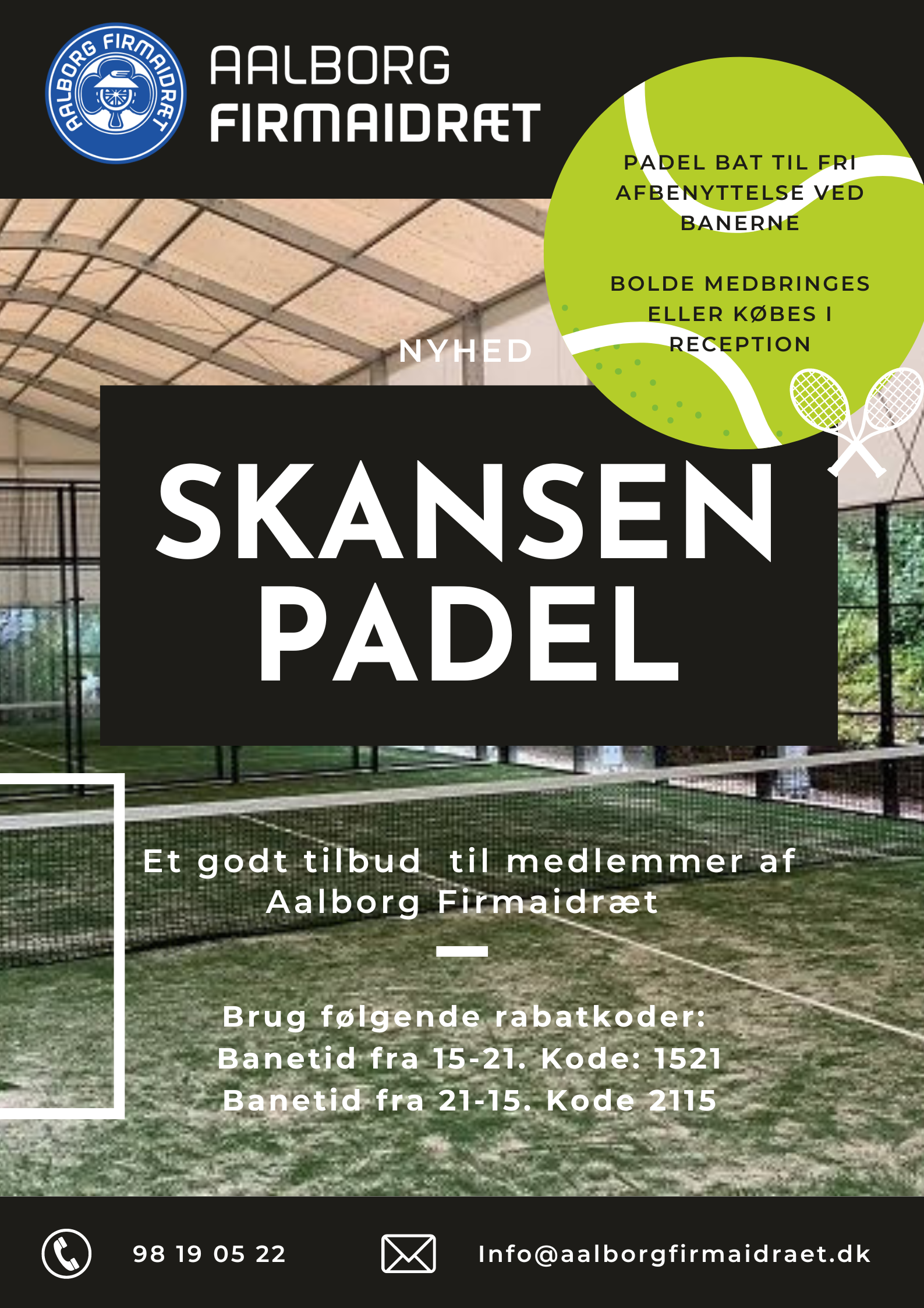 - Spørgsmål i forbindelse med medlemskab af Aalborg Firmaidræt. Mail: skansenpadel@gmail.com - tlf. 9819 0522